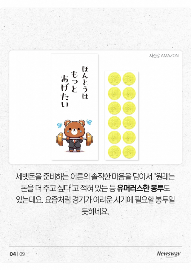 세뱃돈을 준비하는 어른의 솔직한 마음을 담아서 "원래는 돈을 더 주고 싶다"고 적혀 있는 등 유머러스한 봉투도 있는데요. 요즘처럼 경기가 어려운 시기에 필요할 봉투일 듯하네요.