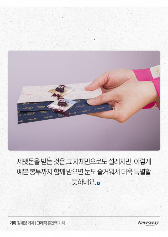 세뱃돈을 받는 것은 그 자체만으로도 설레지만, 이렇게 예쁜 봉투까지 함께 받으면 눈도 즐거워서 더욱 특별할 듯하네요.