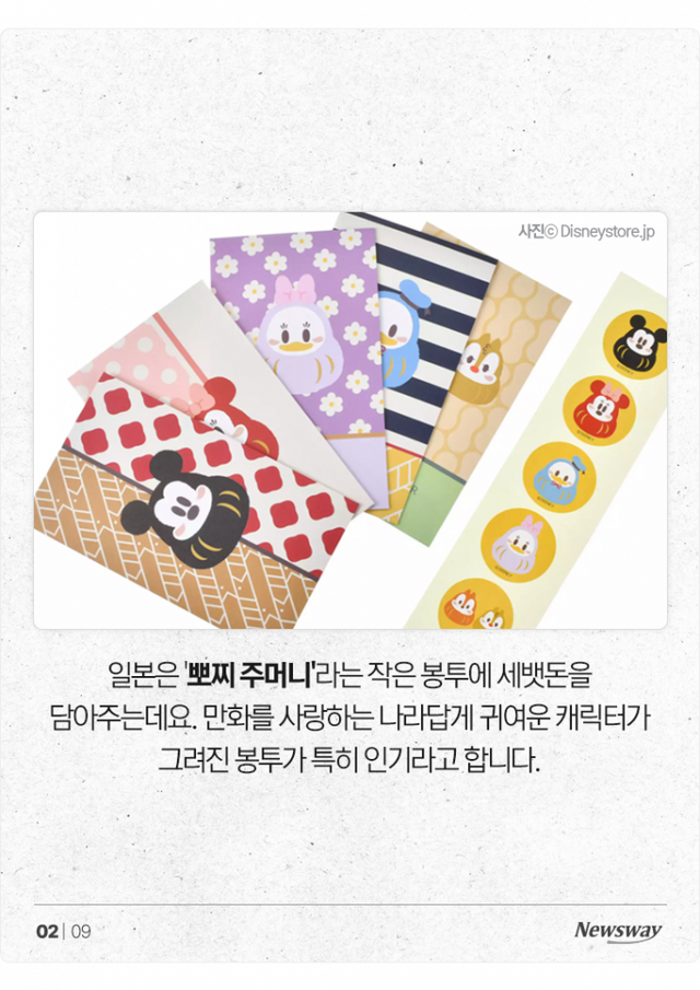 일본은 '뽀찌 주머니'라는 작은 봉투에 세뱃돈을 담아주는데요. 만화를 사랑하는 나라답게 귀여운 캐릭터가 그려진 봉투가 특히 인기라고 합니다.
