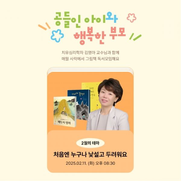 그림책심리성장연구소장이자 독서 치유 상담사인 김영아 교수가 참여하는 ‘공들인 아이와 행복한 부모’는 어린 자녀를 둔 부모를 대상으로 하는 독서모임 시리즈다. 예스24의 독서 커뮤니티 ‘사락’을 통해 신청 가능하다. 오는 2월부터 7월까지 매월 1회 ZOOM 온라인 강의를 통해 진행된다.