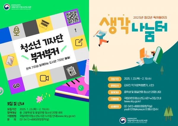 국립어린이청소년도서관은 오늘(23일)부터 2월 19일까지 청소년 프로그램인 기자단 ‘부커부커’와 독서동아리 ‘생각나눔터’의 참가자를 모집한다.