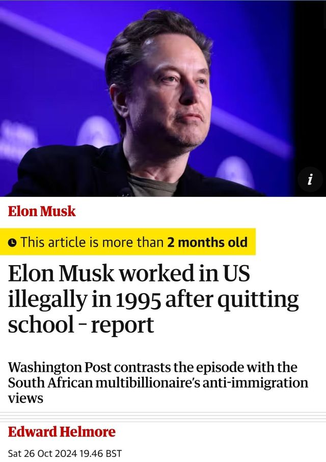 2. 일론 머스크남아공에서 미국으로 학생 비자로 넘어갔던 일론 머스크는 1995년 스탠포드를 그만 둔 이후에도 미국에 남아 Zip2를 개발하였기 때문에 멜라니아와 마찬가지로 불법 이민자였었음. 둘 다 이후로 취업 비자, 그리고 미 시민권까지 미 국적의 투자자/고용자들 덕분에 얻음