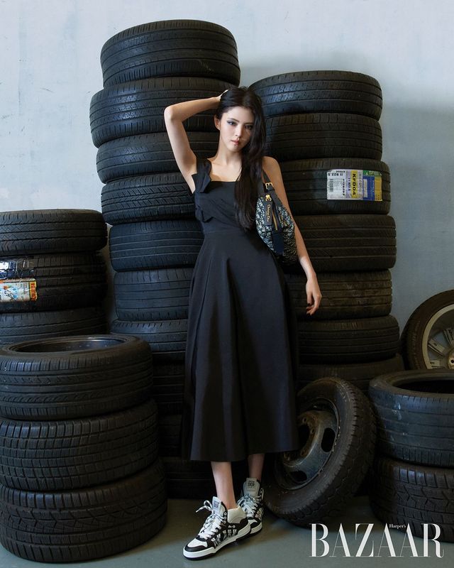 원 숄더 드레스, 오블리크 패턴의 ‘디-저니(D-Journey)’ 백, 스니커즈는 모두 Dior.
