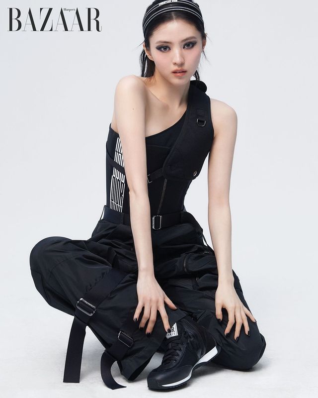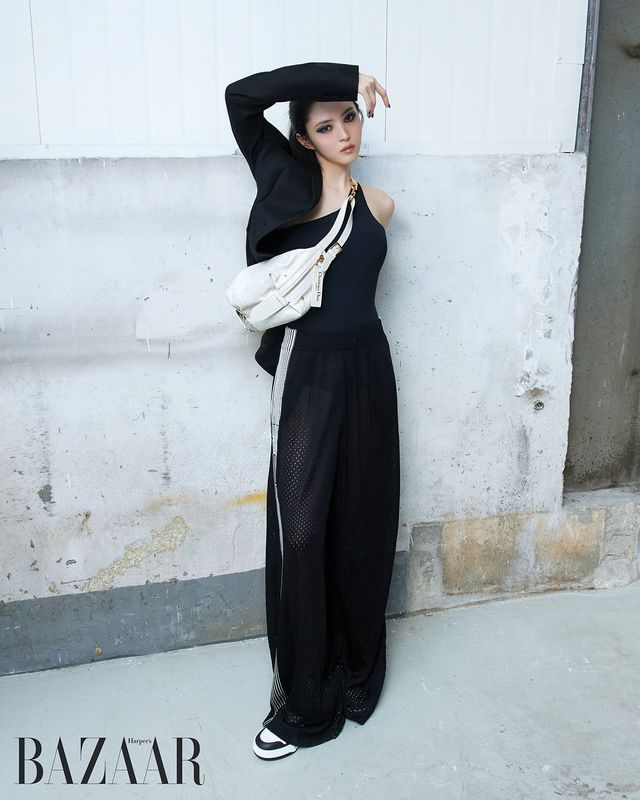 원 숄더 톱, 베스트, 팬츠, 헤어밴드, 슈즈는 모두 Dior.