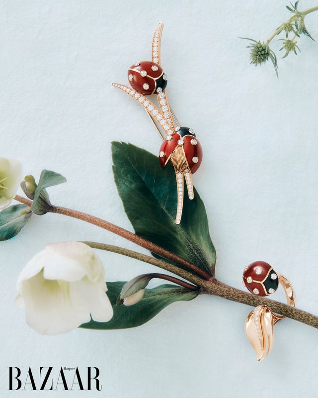 (왼쪽부터) 로즈 골드, 화이트 골드에 다이아몬드와 두 마리 레이디 버그가 장식된 '코치넬 클립', 로즈 골드와 화이트 골드, 무당벌레 모양 장식 위 오닉스, 다이아몬드로 구성된 '코치넬 비트윈 더 핑거 링', 모두 Van Cleef & Arpels.