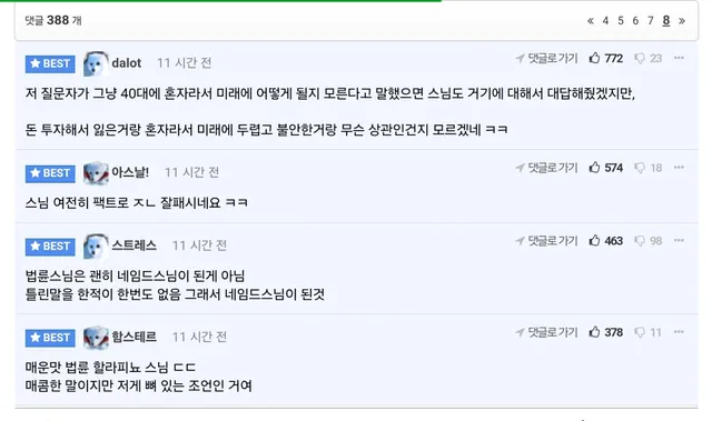 댓글들 반응창은 아주 호의적이고 스님 칭찬으로 일색이다