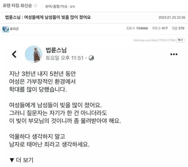 반대로 법륜스님이 남성을 까는 글을 올린 똑같은 작성자