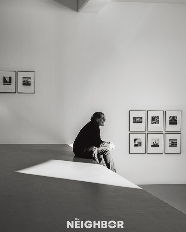 그가 담은 빌딩은 거대한 크기와 차가운 소재에도 왜 나무나 산처럼 자연의 일부로 보일까? 자연과 달리 고정된 건축물에는 어떻게 접근하는지 물었다. “대상을 구분하는 편은 아니다. 우주의 모든 것에 차이점보다 공통점이 많다고 여긴다. 물론 인간은 제한된 지각으로 생물과 무생물을 구분할 뿐이지만. 모든 대상에 존중과 경이를 안고 접근하려 한다. 동시에 촬영하는 모든 피사체에서 인간적 면모를 찾는 편이다. 특히 나무에는 독특하고 고유한 인간적 특성이 있다. 그들이 대답하건 하지 않건 촬영하는 대상과 내면의 대화를 나눈다.” 그는 사진에 담을 풍경과 대상을 찾기 위해 계속해서 걷는 것으로 알려졌다. “내 앞에 있는 모든 것이 피사체가 될 수 있다. 하지만 그중에서도 특유의 분위기나 뒷이야기가 있는 것에 끌린다. 지난 50년의 커리어를 돌아보자면, 인간이 창조한 구조물과 자연 사이의 연결, 관계, 대조, 심지어 적대감까지 촬영한다고 정리할 수 있다.” 언제나 단언을 피하는 사려 깊은 작가는 “이 또한 전체를 일반화한 것일 뿐, 작업하는 대상이 모두 이 같은 범주에 속하지는 않는다”고 덧붙였다.