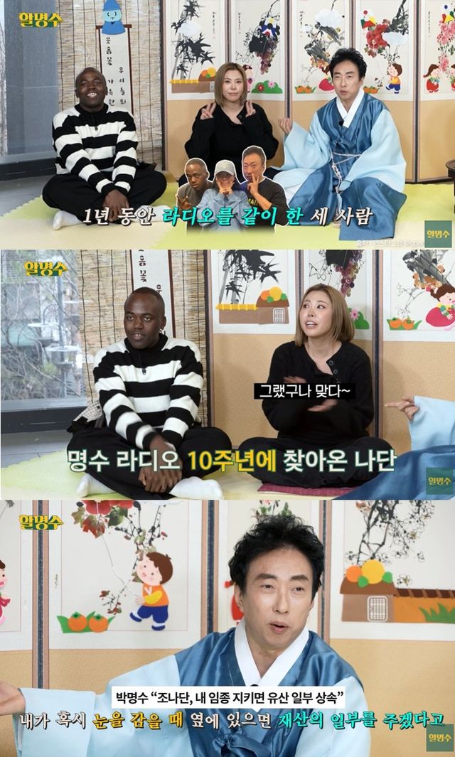 또 박명수는 조나단에 대해 설명하면서 조나단이 '라디오쇼' 10주년 녹화에도 출연했다고 덧붙였다. 그는 "(당시 라디오에서) 내가 눈을 감을 때 (조나단이) 옆에 있으면 재산의 일부를 주겠다고" 밝혔던 사실을 말했다.
