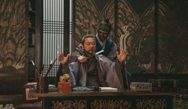 그런가 하면 용천루의 주인 천방주는 시끌벅적한 전야제를 뒤로하고 혼자 자신의 거처에서 일에 집중하고 있다. 그러나 평온함도 잠시, 탈을 쓴 괴한이 나타나 천방주의 목에 칼을 들이대며 그를 협박하는 모습이 포착됐다. 사진 속 천방주는 두 손을 들고 괴한의 협박에 굴복한 모습으로 극의 긴장감을 극대화한다.