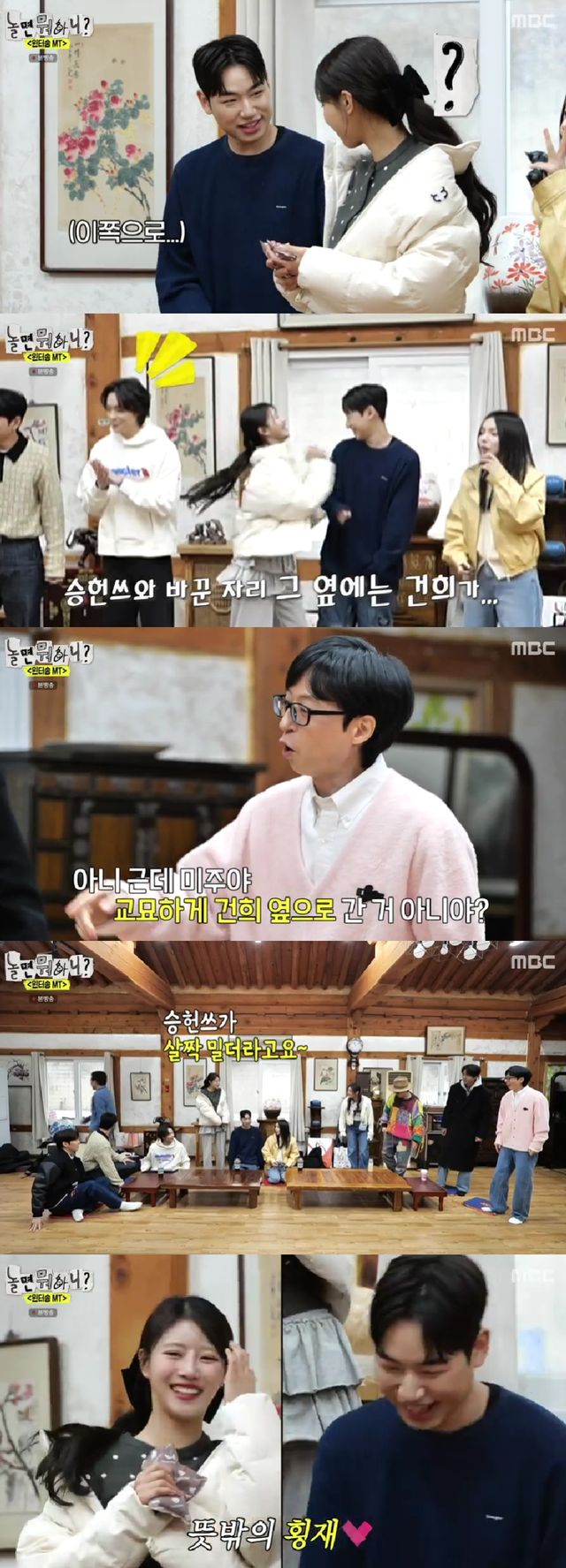 이날 MT 장소에 모든 멤버들이 모인 가운데, 테이블에 앉을 자리를 두고 한 차례 소동이 벌어졌다. 승헌쓰는 미주에게 자리를 양보했으며 승헌쓰와 자리를 바꾼 자리 옆에는 송건희가 있어 미주는 부끄러운 듯 승헌쓰의 팔을 치는 모습이 포착됐다.