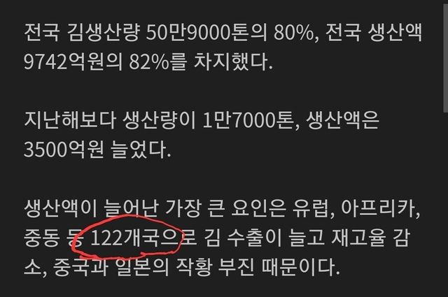 한국산 김 양식 생산량이 계속 늘고 있지만 김 양식 특성상 한계가 있어서 폭등하는 수출량 맞추느라 갈수록 국내 유통량을 커버하기가 어려워짐.