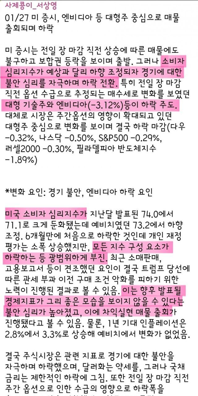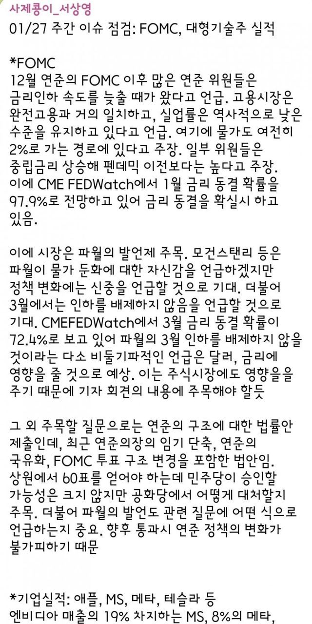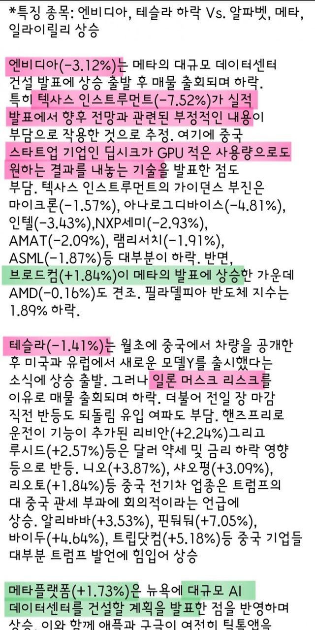 이번주 수요일에 메타, 마이크로소프트, 테슬라의 실적발표가 있는데, 어닝콜 내용중에 AI SW 효율화를 통한 GPU 지출을 줄인다는 언급이 나올시 엔비디아를 필두로 한 반도체 섹터에 큰 조정이 올 확률이 상당하다고 보는 게 합리적.