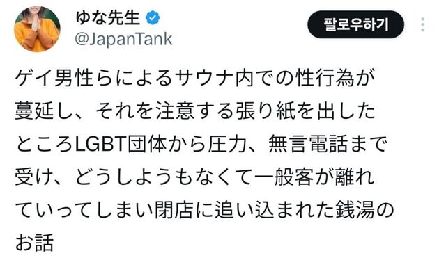 사우나측은 공공시설에서 그런짓 하지말라고 홍보물 걸어두었는데 LGBT 단체에서 항의성 전화, 압력 받음