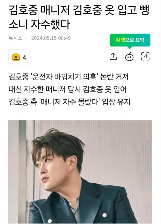 운전자를 바꿔치기한 것 아니냐는 의혹에 관해 소속사 측은 “사고가 발생하자 김호중은 골목으로 차를 세우고 매니저와 통화를 했고, 그사이 택시 기사님이 경찰에 신고했다”며 “이후 상황을 알게 된 매니저가 본인이 처리하겠다며 경찰서로 찾아가 본인이 운전했다고 자수를 했다”고 해명했다. 그러면서 “이 사실을 알게 된 김호중은 경찰서로 가 음주측정을 받았다”며 “검사 결과 음주는 나오지 않았으며, 사고 처리 결과를 기다리고 있는 상황”이라고 했다.
