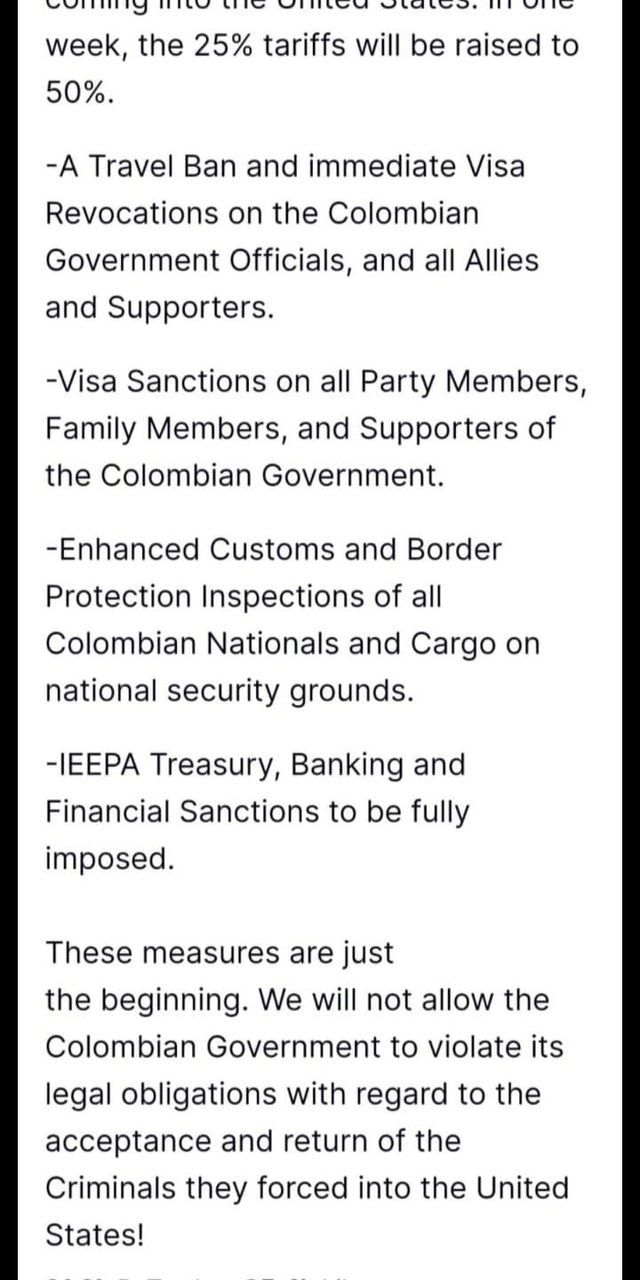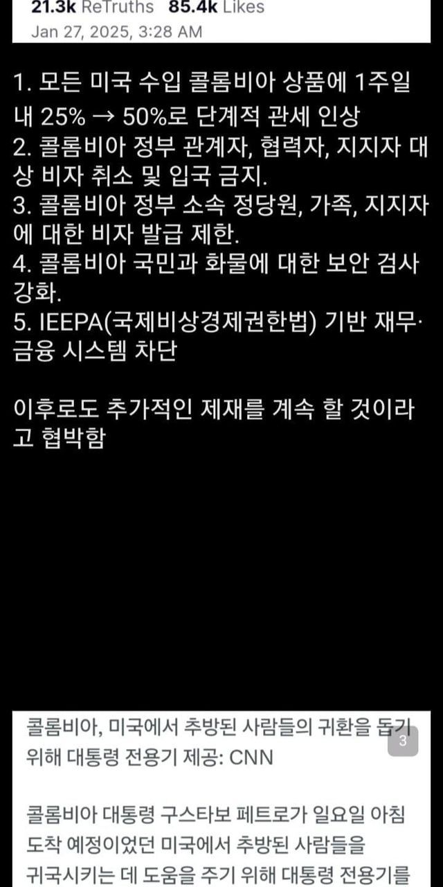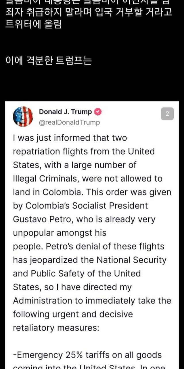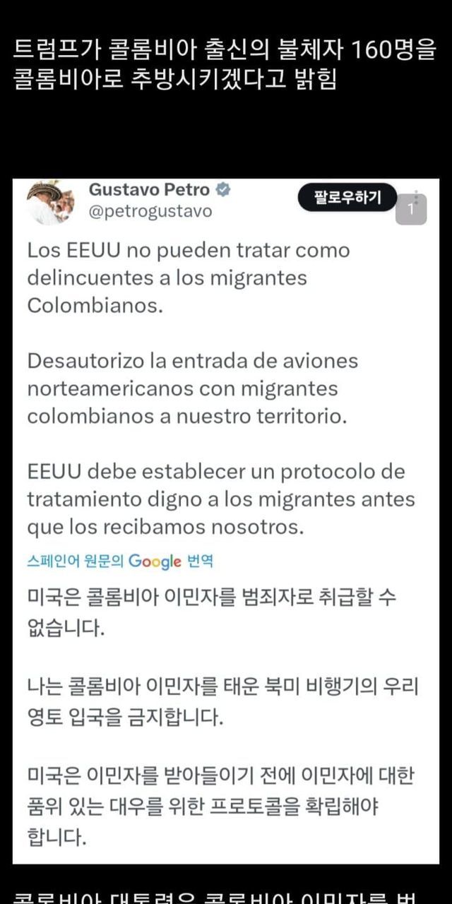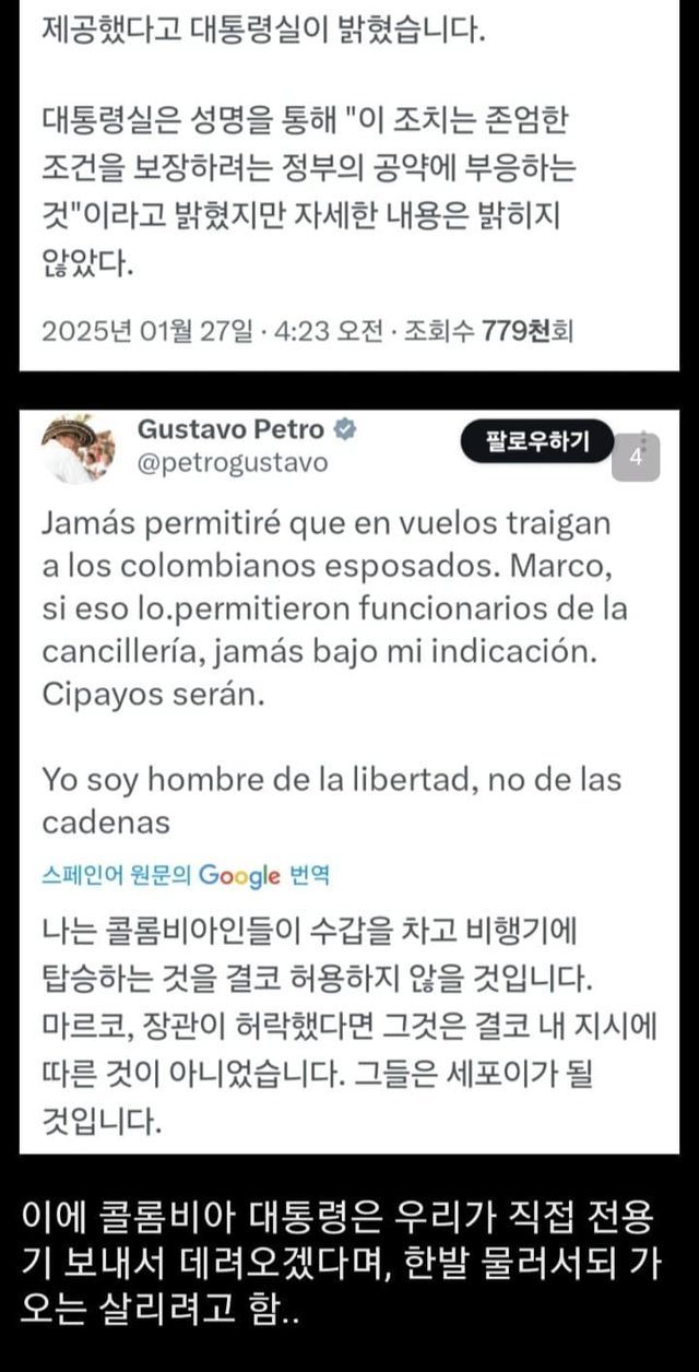 콜롬비아 대통령 겁먹고 9시간만에 군용기 송환 포함 모든 조건에 동의