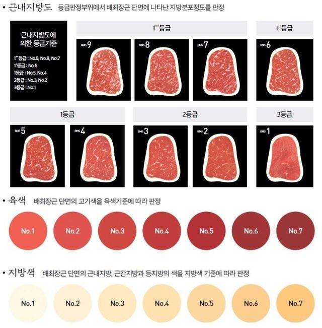소고기 근내지방도, 육색, 지방색 등급. / 농촌진흥청 제공