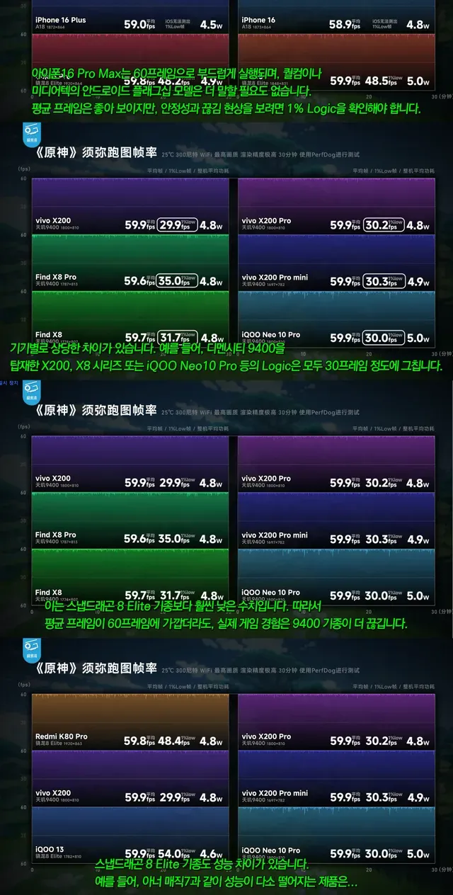 평균프레임 하위프레임 소비전력 종합적으로 보면 디멘시티 9400의 경우 동세대 경쟁 AP인 8엘리트 A18 Pro와는 격차가 명확한 듯