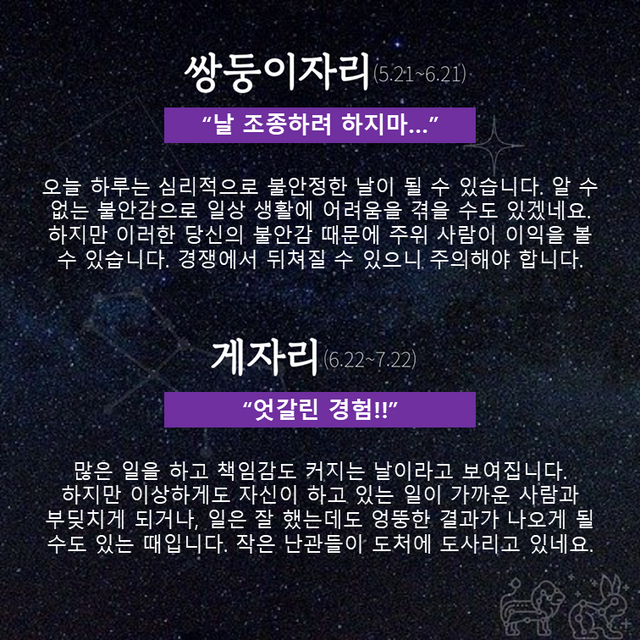 주변의 가까운 사람과 마찰이 생길 수 있는 날입니다. 당신에게 문제가 있기 보다는 친구나 연인 혹은 가족 등 당신과 가까운 사람에게 문제가 발생할 수 있겠네요. 이들을 위로할 의무가 있으니 상대의 까칠함에 똑같이 까칠함으로 반응해서는 안 됩니다.