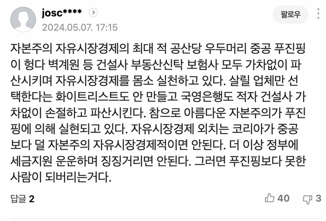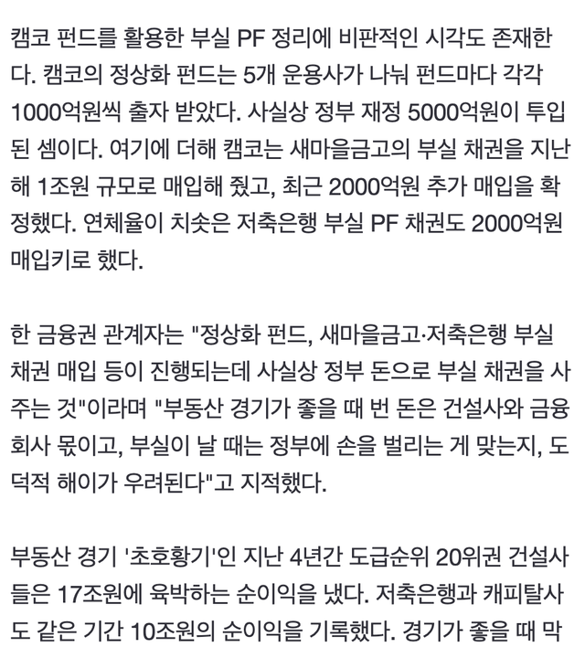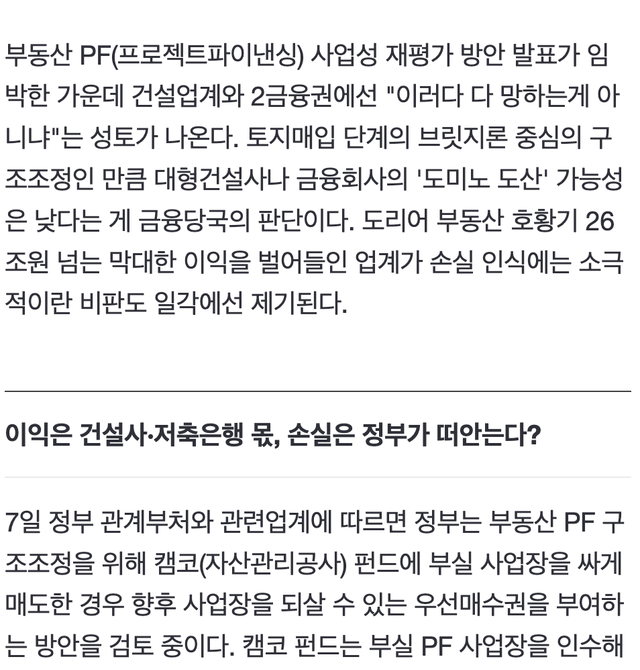 “부동산 경기가 좋을 때 번 돈은 건설사와 금융회사 몫이고, 부실이 날 때는 정부에 손을 빌리는 게 맞는지, 도덕적 해이가 우려된다.”