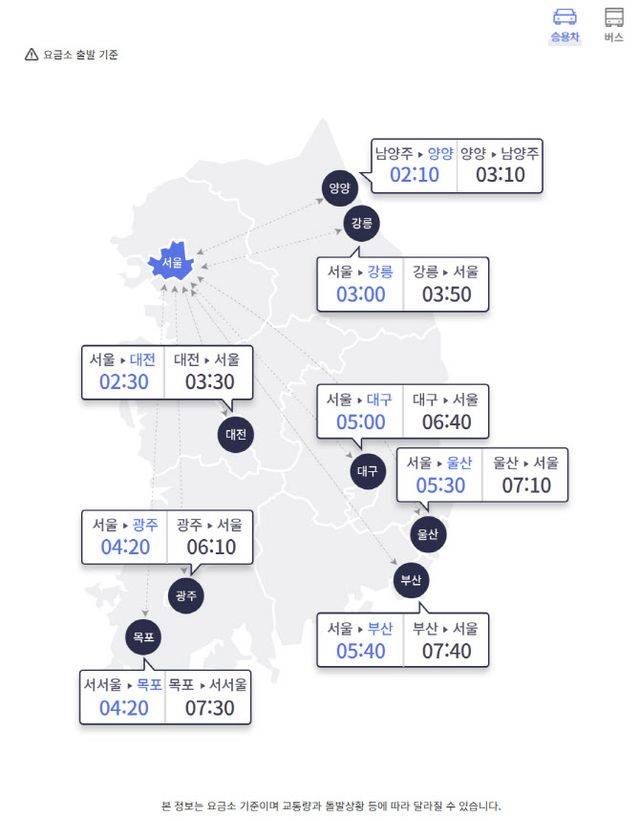 한국도로공사에 따르면 이날 오후 4시 서울 요금소를 출발해 승용차로 전국 주요 도시 요금소까지 가는 데 걸리는 예상 시간은 부산 5시간 40분, 울산 5시간 30분, 대구 5시간, 목포 4시간 20분, 광주 4시간 20분, 강릉 3시간, 대전 2시간 30분 등이다. 오전보다는 다소 정체가 풀리는 모습이다.