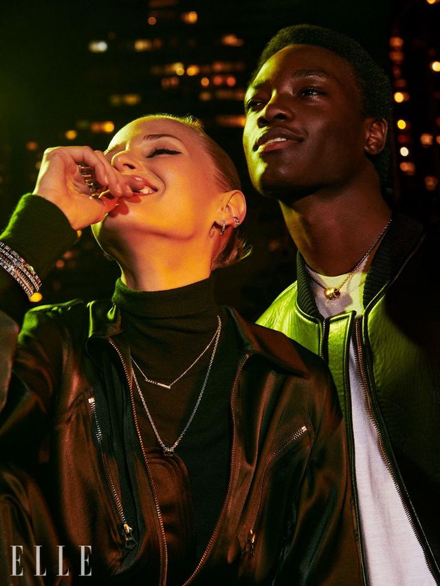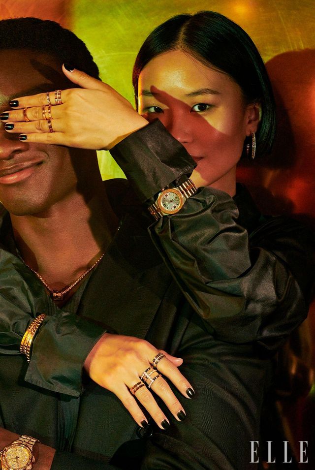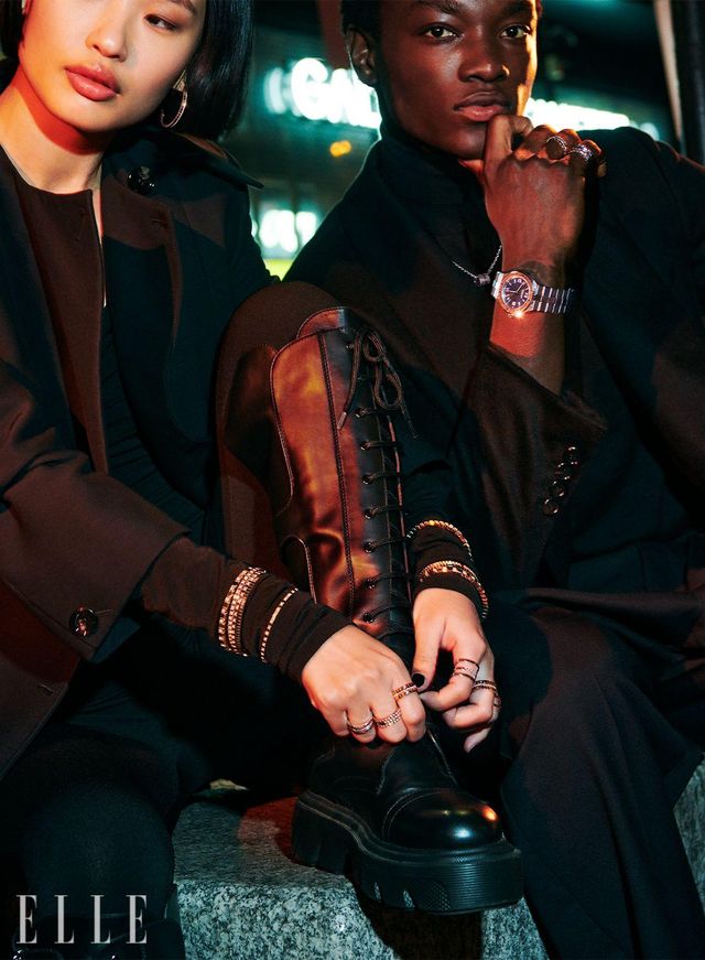 3 잔이 착용한 에시컬 18K 화이트 골드에 다이아몬드를 세팅한 아이스 큐브 네크리스와 링, 브레이슬릿, 이어링, 에시컬 18K 로즈 골드 아이스 큐브 이어 커프는 모두 Chopard. 코튼 재킷과 톱은 모두 Philosophy by Lorenzo Serafini. 아리나가 착용한 다이아몬드를 세팅한 에시컬 18K 화이트, 옐로, 로즈 골드 아이스 큐브 펜던트와 브레이슬릿, 이어링, 링은 모두 Chopard. 레더 봄버 재킷은 Karl Lagerfeld. 팬츠는 Philosophy by Lorenzo Serafini