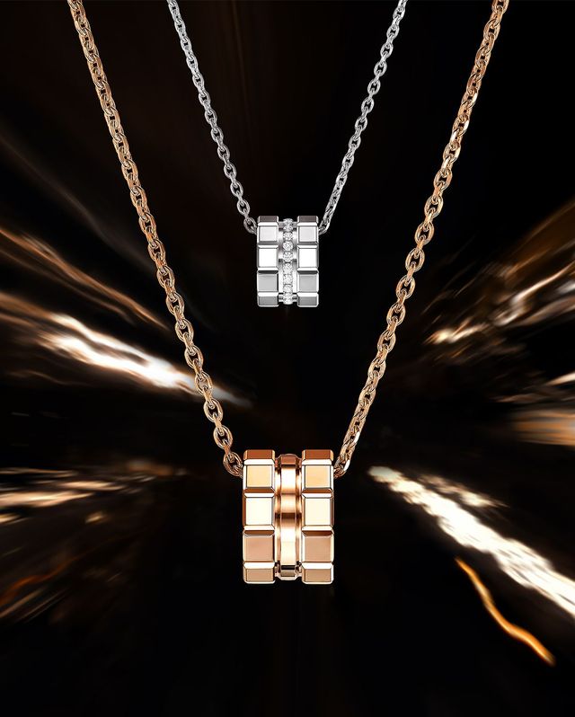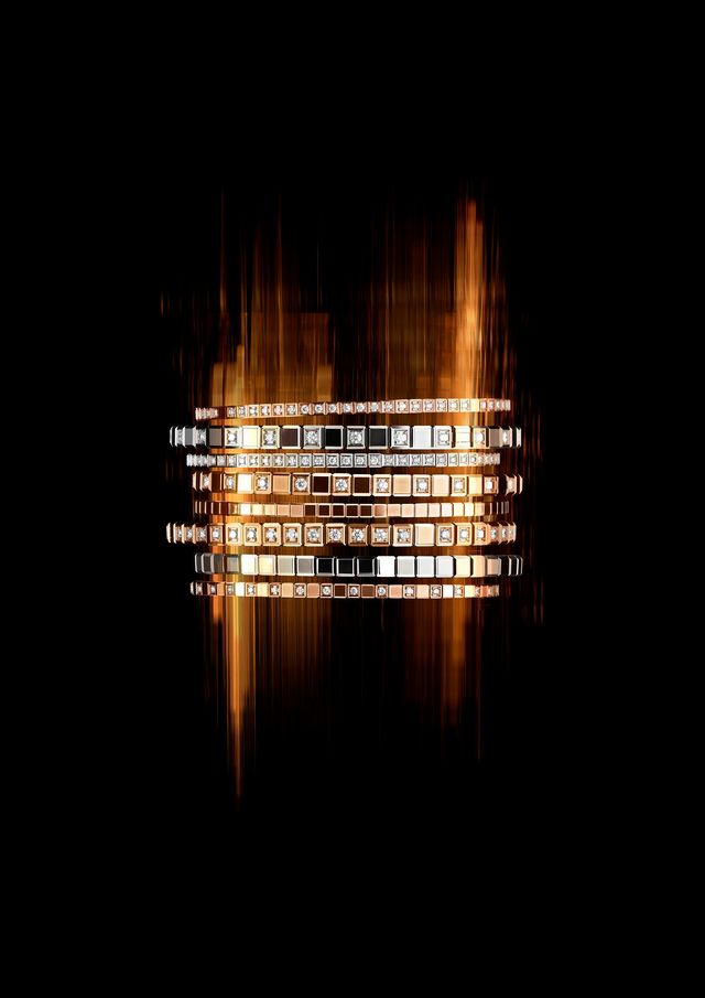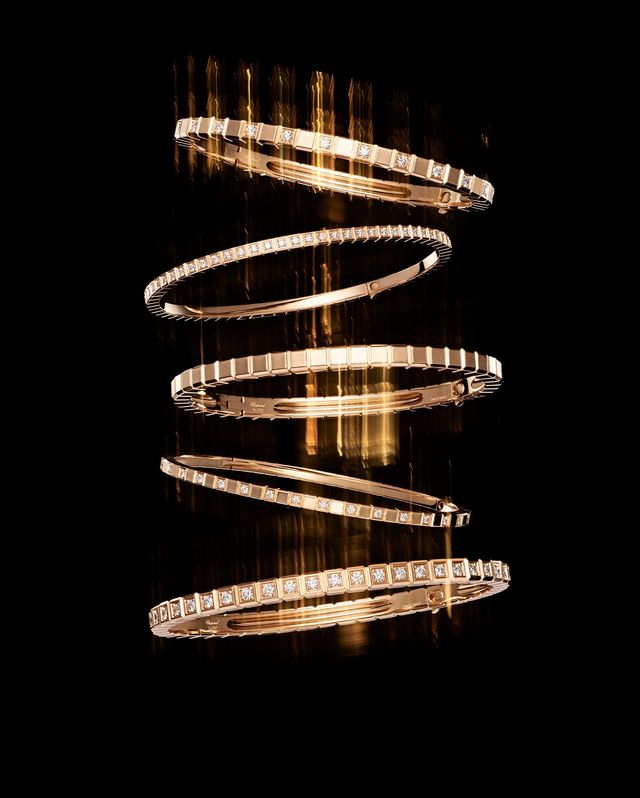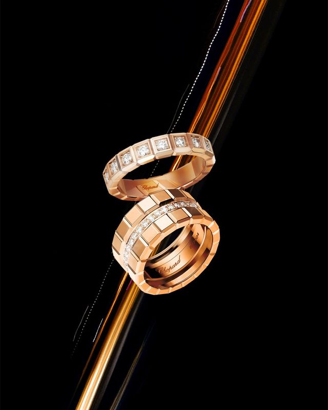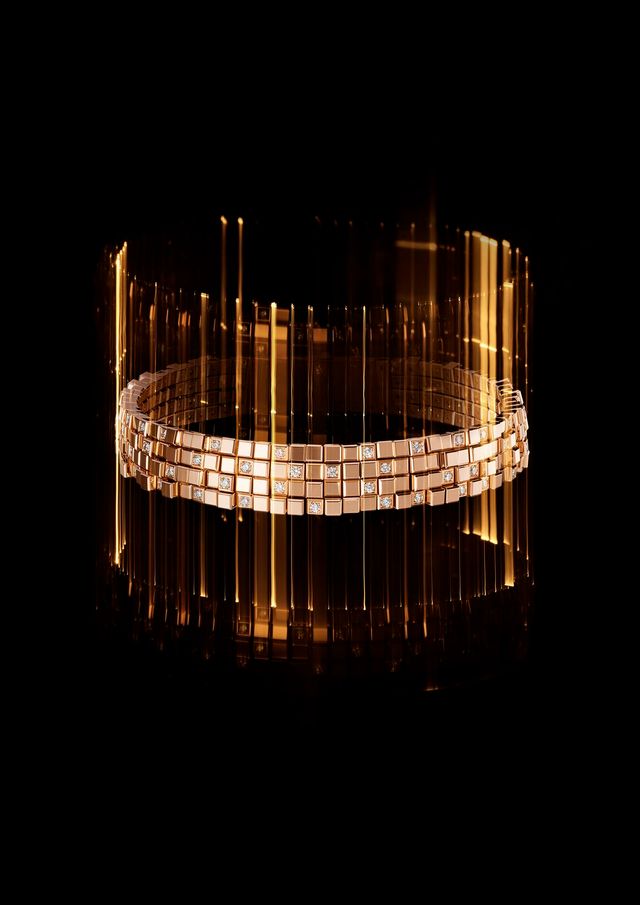아이스 큐브 컬렉션은 빛을 받는 각도에 따라 다채로운 광채를 띤다. 100% 윤리적 방식으로 채굴한 금(에시컬 골드)은 24시간 쉬지 않고 외면은 물론 내면까지 밝혀준다. 네모 형태의 기하학적 디자인은 쇼파드의 창의적인 디자이너 캐롤라인 슈펠레(Caroline Scheufele)의 작품. 사각 얼음에서 영감을 받은 그녀는 자신의 작업실에서 이를 현실로 구현했다.