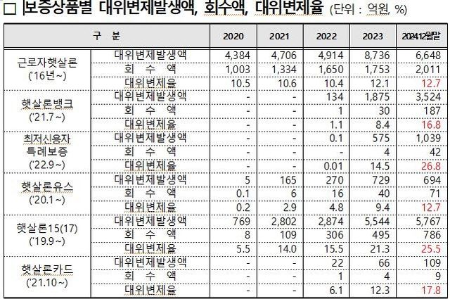 차주가 대출을 갚지 못해 정책기관이 대신 갚아줘야 하는 금액인 총 대위변제발생액도 증가했다. 작년 말 기준 근로자햇살론·햇살론뱅크·최저신용자특례보증·햇살론유스·햇살론15·햇살론카드의 대위변제발생액은 1조7781억원으로 전년말(1조7525억원) 대비 더 늘었다. 상품별로 보면 근로자햇살론(6648억원), 햇살론15(5767억원), 햇살론뱅크(3524억원) 순으로 대위변제발생액이 많았다.
