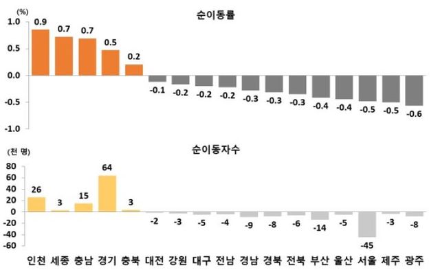 시도별 순이동률 및 순이동자 수, 2004. 통계청 제공