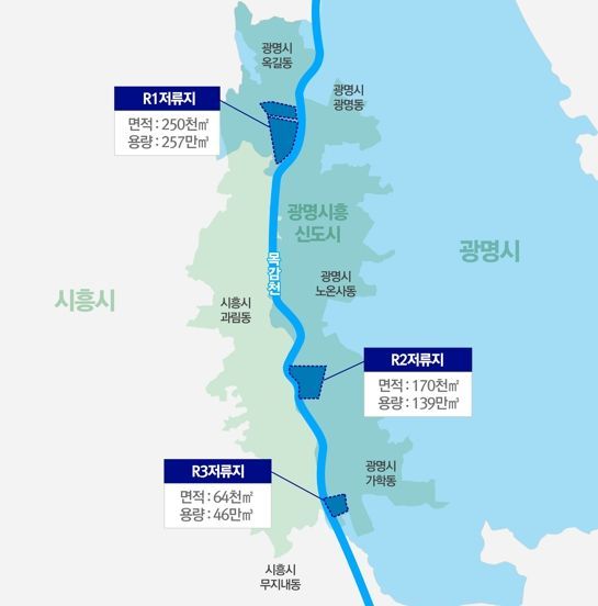 저류지는 ▲광명시 옥길동 일원에 24만 9천745㎡ 규모로 조성되는 R1 ▲광명시 노온사동 일원에 16만 9천725㎡ 규모로 조성되는 R2 ▲광명시 가학동 일원에 6만 3천803㎡ 규모로 조성되는 R3 등 3개다.