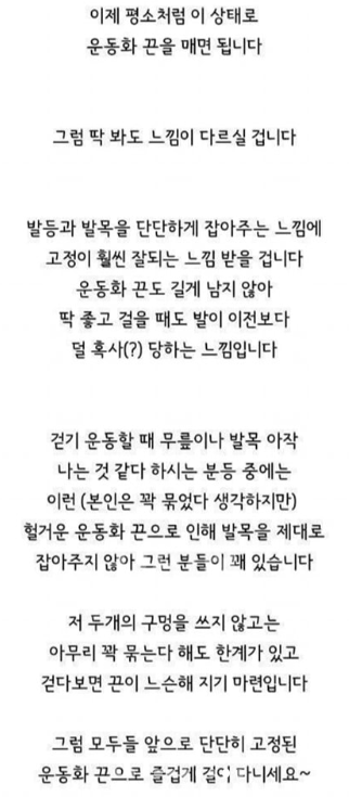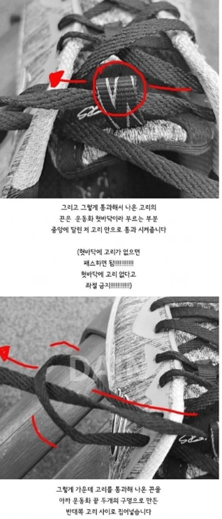 러너스 노트라고 오래전 아식스에서 개발한 기술이며, 지금은 특허 만료되서 대부분 운동화 만드는 회사에서 쓰이고 있음. 저 형태로 신발을 묶으면 뒷꿈치 들리는 일 없이
