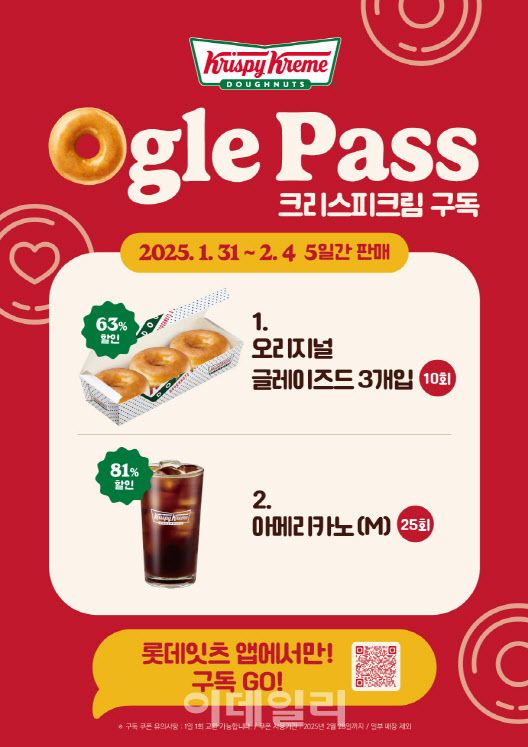 이에 따라 크리스피크림 도넛을 애용하는 고객이 2종 모두 이용 시 최대 11만9000원의 금액 혜택을 받을 수 있다. 구독권은 롯데잇츠 앱에서 2월 4일까지 5일간 구매 가능하며 2월 한달 간 1일 1회 사용 가능하다.