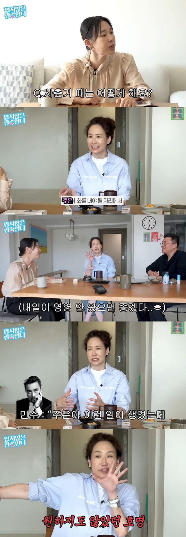 최민수가 큰 사고를 쳤을 때도 화를 내기보다 "내일 얘기하자"라고 말한다고 밝힌 강주은은 "나는 어떤 상황인지도 모르는데 남편이 '주은아, 이런 일이 생겨서 기자회견을 할 거다'라고 하더라. 일단 어떤 옷을 입을지 정리부터 하고 나중에 얘기했다"고 설명했다.