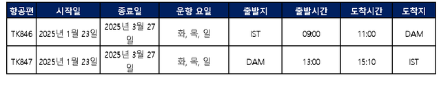 터키항공의 다마스쿠스 노선은 오는 3월 27일까지 매주 화요일, 목요일, 일요일 주 3회 운항된다.