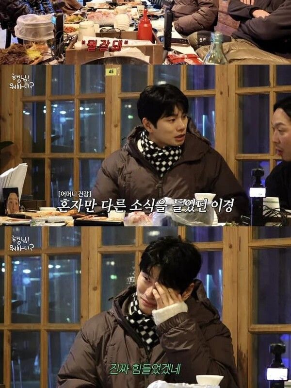 이이경은 어머니가 심장 수술을 했다면서 "아까 하하 형이 부모님 얘기할 때 사실 운전하며 울컥했다. 엄마가 나한테는 '수술하니까 잘 때 심장이 안 저리고 너무 좋다'라고 하셨다. 이틀 뒤 누나가 엄마 얘기 들었냐고 묻길래 '수술 잘 됐다며?'라고 물으니 '뭘 잘 돼!'라며 울더라. 내가 엄마에게 들은 것과 너무 달랐다"라며 눈물을 흘렸다. 이어 "아버지가 나한테는 모임이 있어서 어머니와 태국에 간다고 했는데 그게 아니었던 것 같다.