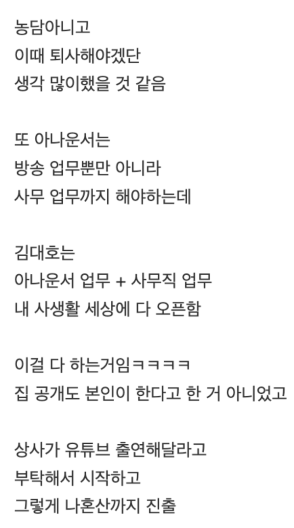 그는 방송에서 자신이 진행하던 MBC ‘생방송 오늘 저녁’의 ‘퇴근 후N’ 코너가 ‘나 혼자 산다’ 이후 정규 편성되어 ‘김대호의 퇴근 후N’이라는 단독 프로그램으로 제작된 사실을 전하며 인기가 실감된다고 전했다.