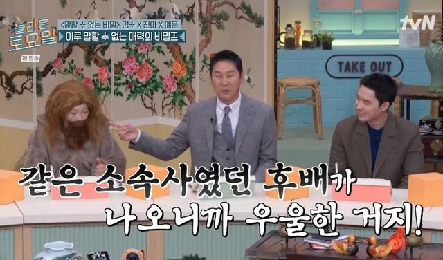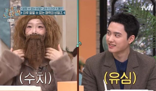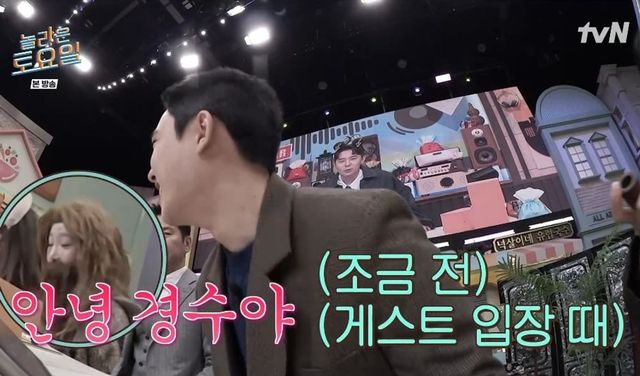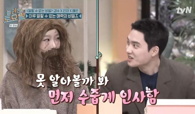 이에 신동엽은 “직속 후배 나왔을 때 이러니까 좀 우울한 거다”라며 태연을 놀렸다. 태연은 “너무 오랜만에 보는데 못 알아볼까 봐”라고 했고, 도경수는 “진짜 오랜만에 뵌다”고 인사했다. 조금 전 게스트 입장 때 태연은 못 알아볼까봐 먼저 수줍게 “안녕. 경수야”라고 인사했고, 도경수는 태연을 보고 웃었다.