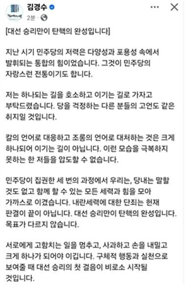 김 전 지사는 특히 개딸 등 친명계를 겨냥 “칼의 언어로 대응하고 조롱의 언어로 대처하는 것은 크게 하나되어 이기는 일이 아니다”며 “서로에게 고함치는 일을 멈추고, 사과하고 손을 내밀고 크게 하나가 되어야 이긴다”고 당 통합을 호소했다.