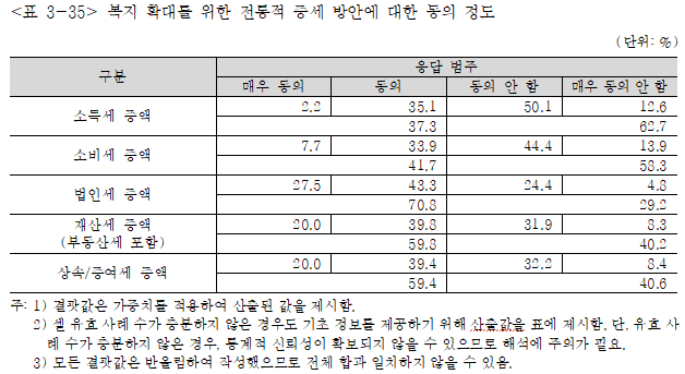 증세 및 감세 일반에 대해서도 감세 지지 응답이 다수였다. '경제 활성화를 위해 세금을 줄여야 한다'는 데 대한 동의 비율은 64.4%였던 반면'사회복지 확대를 위해서 세금을 더 거둬야 한다'는 데 대한 동의 비율은 42.5%에 그쳤다.