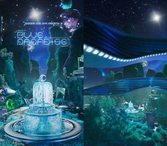 뿐만 아니라 미니 5집 '블루 파라다이스' 앨범 포스터도 베일을 벗었다. 건물들을 지나치자 등장하는 분수대를 중심으로 펼쳐진 풍경은 신비로운 무드를 자아내며 눈길을 끌었다.