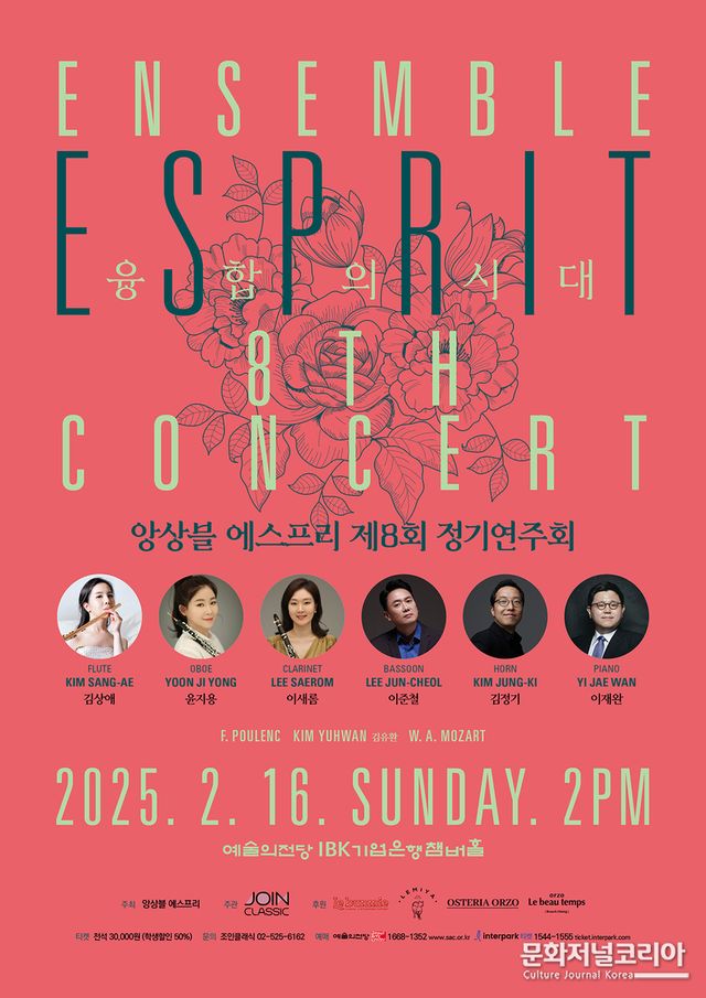 문화저널코리아 김영일 기자 | 앙상블 에스프리(Esprit) 제8회 정기연주회(ENSEMBLE ESPRIT 8th Concert) ’융합의 시대‘가 오는 2월 16일(일) 오후2시 예술의전당 IBK기업은행챔버홀에서 열린다.