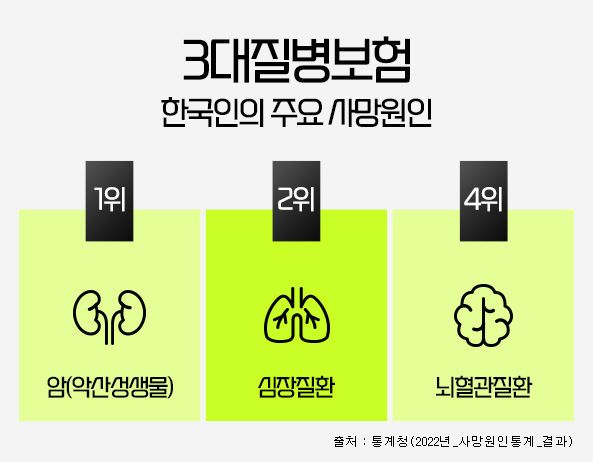 [와이뉴스] 흔히 3대질병이라 일컫는 암, 심혈관질환, 뇌혈관질환은 통계청 발표자료에 따르면 한국인의 주요 사망원인 중에서 3위 폐렴을 제외하고 1~4위를 차지하고 있으며, 이전부터 지금까지도 살면서 가장 먼저 대비해야 하는 치명적인 질병으로 강조되고 있다. 이러한 중대질병에 대비하기 위하여 상기 세가지 치명적인 질병을 집중보장하는 3대질병진단비보험을 많이 가입하고 있다. 3대진단비보험은 각각의 질병을 중점적으로 보장하면서도 가입자 특성에 맞는 특약을 추가함으로써 종합건강보험으로도 활용할 수가 있다.