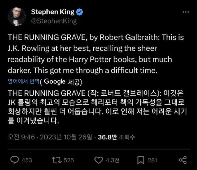 2013년 4월, <쿠쿠스 콜링>이라는 제목의 추리소설이 발간된다
