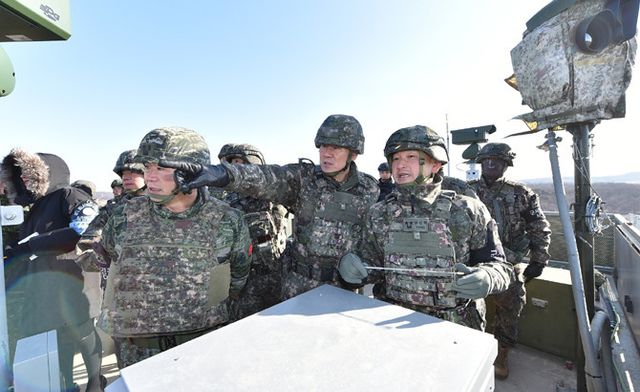 김명수 합참의장이 육군 1사단 예하 GP에서 과학화경계시스템을 확인하고, 최전방 감시·경계작전, 적 도발 대비 생존성 보장 대책, 타격장비 운용 등 제반 작전요소를 면밀하게 점검하고 있다. ⓒ 국방부