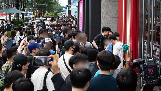 서울 강남구의 한 햄버거 매장 앞에 입장을 기다리는 고객들이 길게 줄지어 서 있다. / 뉴스1