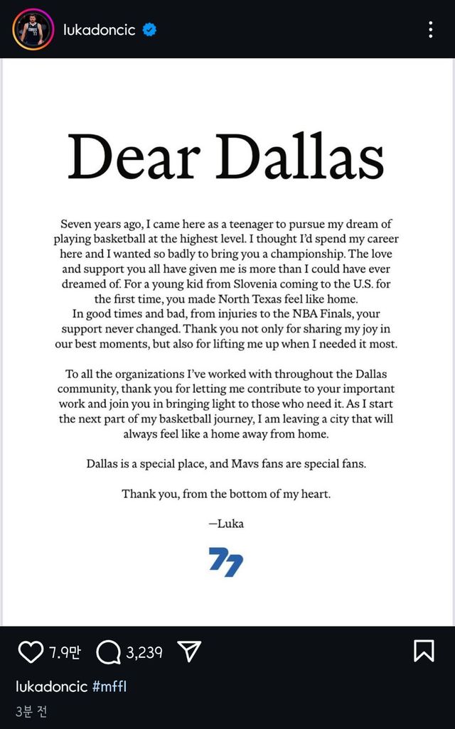 댈러스 지역 사회에서 함께한 모든 단체에도 감사드립니다. 여러분의 중요한 일에 기여할 수 있도록 허락해 주시고, 도움이 필요한 사람들에게 희망을 전하는 데 동참할 수 있게 해주셔서 감사합니다. 이제 제 농구 여정의 다음 단계를 시작하며, 항상 ‘집 같은 곳’으로 느껴질 이 도시를 떠납니다.