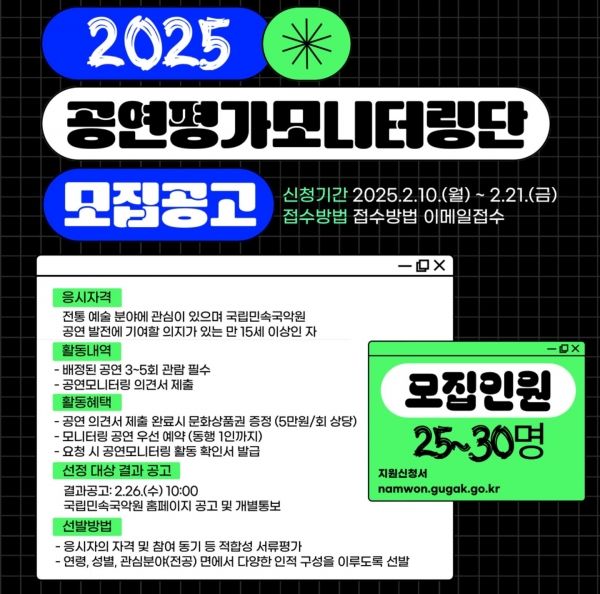 국립민속국악원이 2025년 공연 평가 모니터링단을 모집한다고 4일 밝혔다.