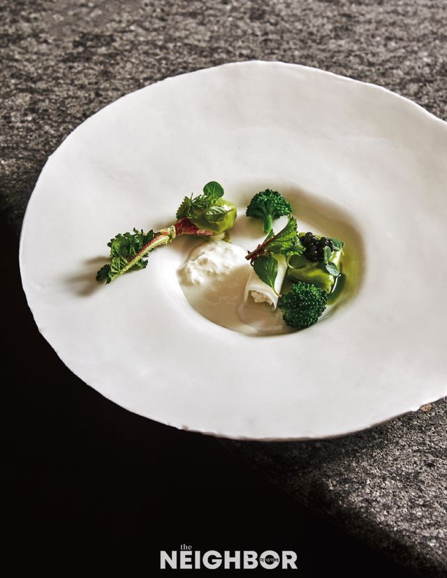 겨울은 채소와 허브가 매운맛을 내는 계절이다. 하지만 제철 채소를 중심에 둔 기가스의 요리는 다르다. 정하완 셰프와 가족이 직접 가꾸는 와니농장이 있어서다. 농장의 겨울철 대표 채소인 래디시와 궁채를 15가지 허브와 염소 치즈로 만든 퓌레로 덮고 캐비아를 올렸다. 와니농장의 겨울, 그리고 기가스의 정체성을 표현한 디시로, 채소 하나하나의 맛을 깊이 음미할 것을 권한다. 푸릇푸릇 생기 있는 색감은 싱그러운 에너지를 전한다.