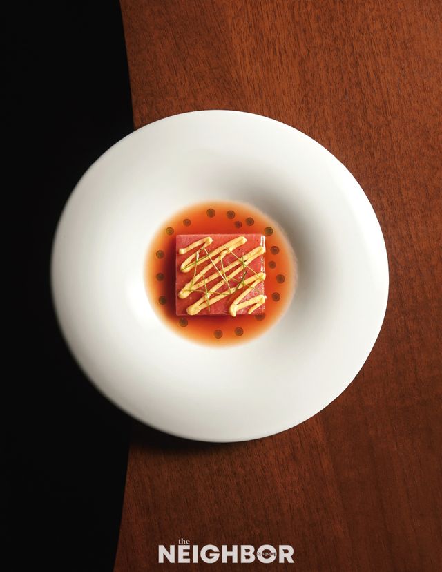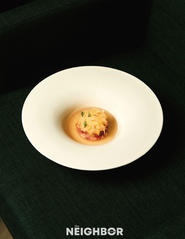 노진성 셰프에게 애피타이저란 간소한 재료를 균형감 있게 조합해 셰프의 색깔을 보여주는 메뉴다. 꼴라쥬는 콜드 애피타이저로 참치 등살과 토마토를 조합한 ‘참치 카르파치오’를 선보인다. 다진 참치 등살을 넓게 펴서 얼린 뒤 재단해 토마토 라타투이 위에 얹고, 수제 마요네즈와 일본 허브 메네기를 올렸다. 여기에 발효 토마토즙을 함께 담고 바질 오일을 떨어뜨려 마무리했다. 애피타이저에 산미를 더하기 위해 보통 식초나 시트러스를 활용하지만, 발효를 적용해 한결 부드러운 산미와 복합적인 풍미를 더한 것이 특징이다.