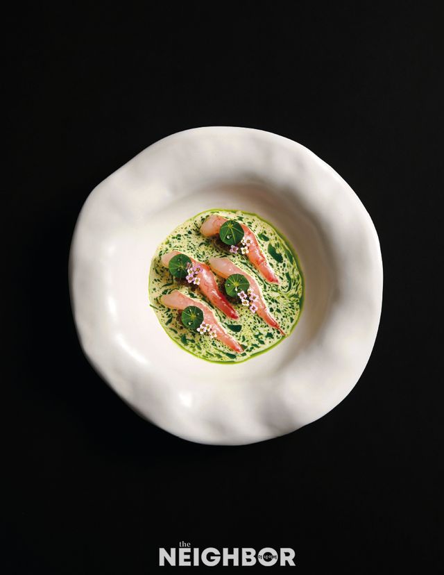 다이닝의 코스를 요리사와 고객의 대화라고 볼 때, 웰컴 디시가 아이스 브레이킹이라면 이어 등장하는 콜드 애피타이저는 셰프의 스타일을 드러내는 출발점이다. 아시아 식재료로 노르딕 퀴진을 선보이는 김영빈 셰프는 아시안과 노르딕 장르에서 공통적으로 중요한 발효에 집중한다. 마테르의 애피타이저 ‘단새우’는 단새우에 포르치니 버섯 발효 오일을 바른 뒤 달군 참숯으로 훈연 향을 입혀 준비했다. 캐비아 위에 단새우를 올리고, 제주산 더덕을 발효해 만든 베어블랑 소스를 곁들인 뒤 메리골드 잎 오일과 무꽃으로 장식하면 완성. 발효의 강렬한 맛과 향을 직관적으로 전달하는 디시다.